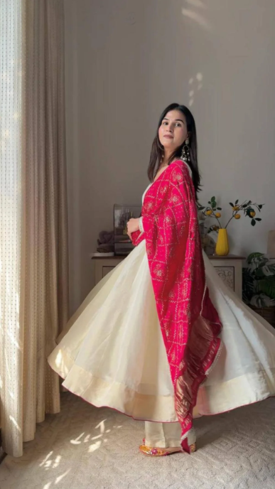 Radiate timeless charm with this Exclusive White Chinnon Gown Set, designed to bring out effortless grace and sophistication. Crafted from premium chinnon fabric, the gown features delicate golden lace and piping detailing, adding a touch of festive elegance to your look.