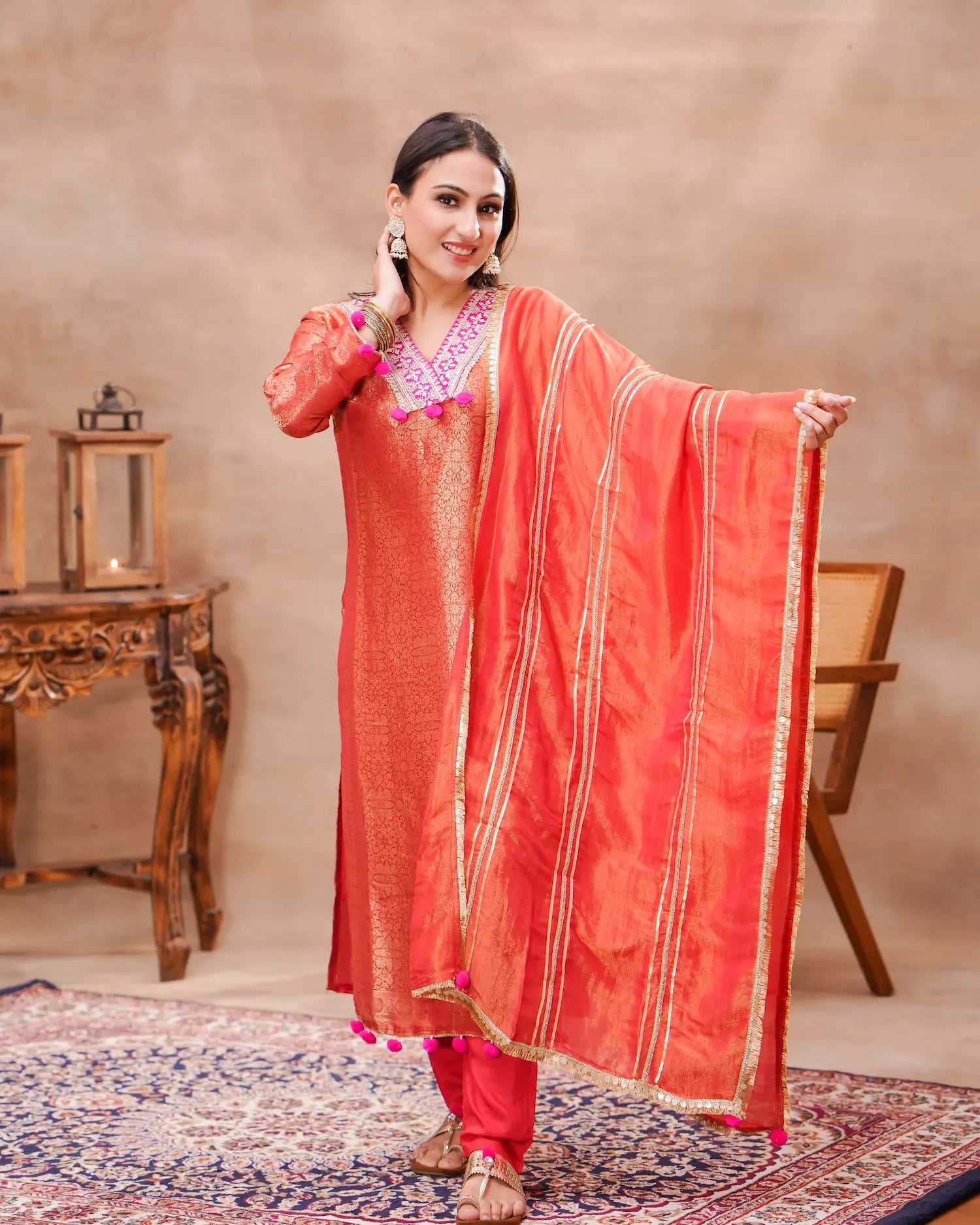 The look is complemented with a coordinated silk dupatta, finished with delicate fringe lace detailing that adds subtle movement and a refined statement. The warm rust tone enhances the richness of the brocade, making this set a graceful choice for celebrations and traditional gatherings.